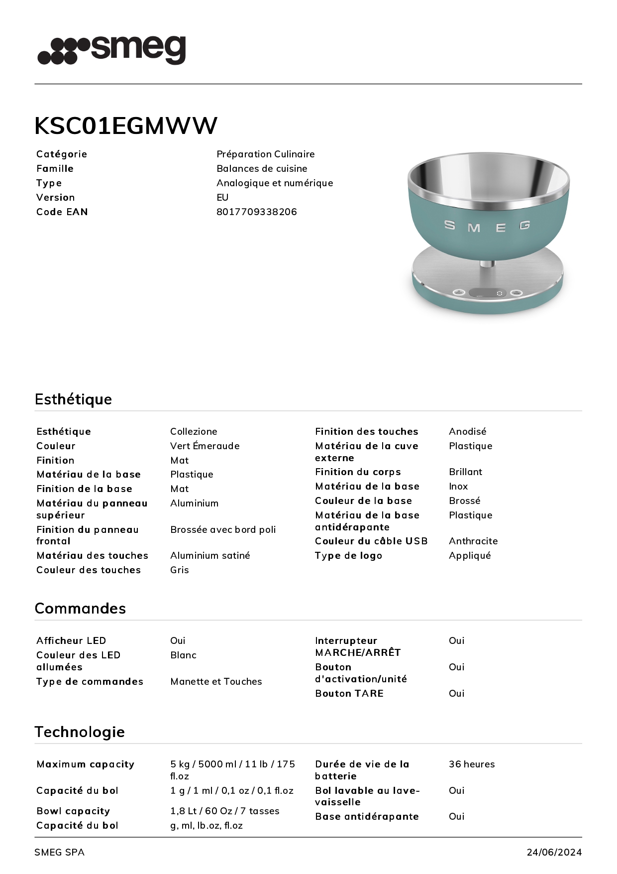 Balance de cuisine SMEG Vert Émeraude Mat KSC01EGMWW