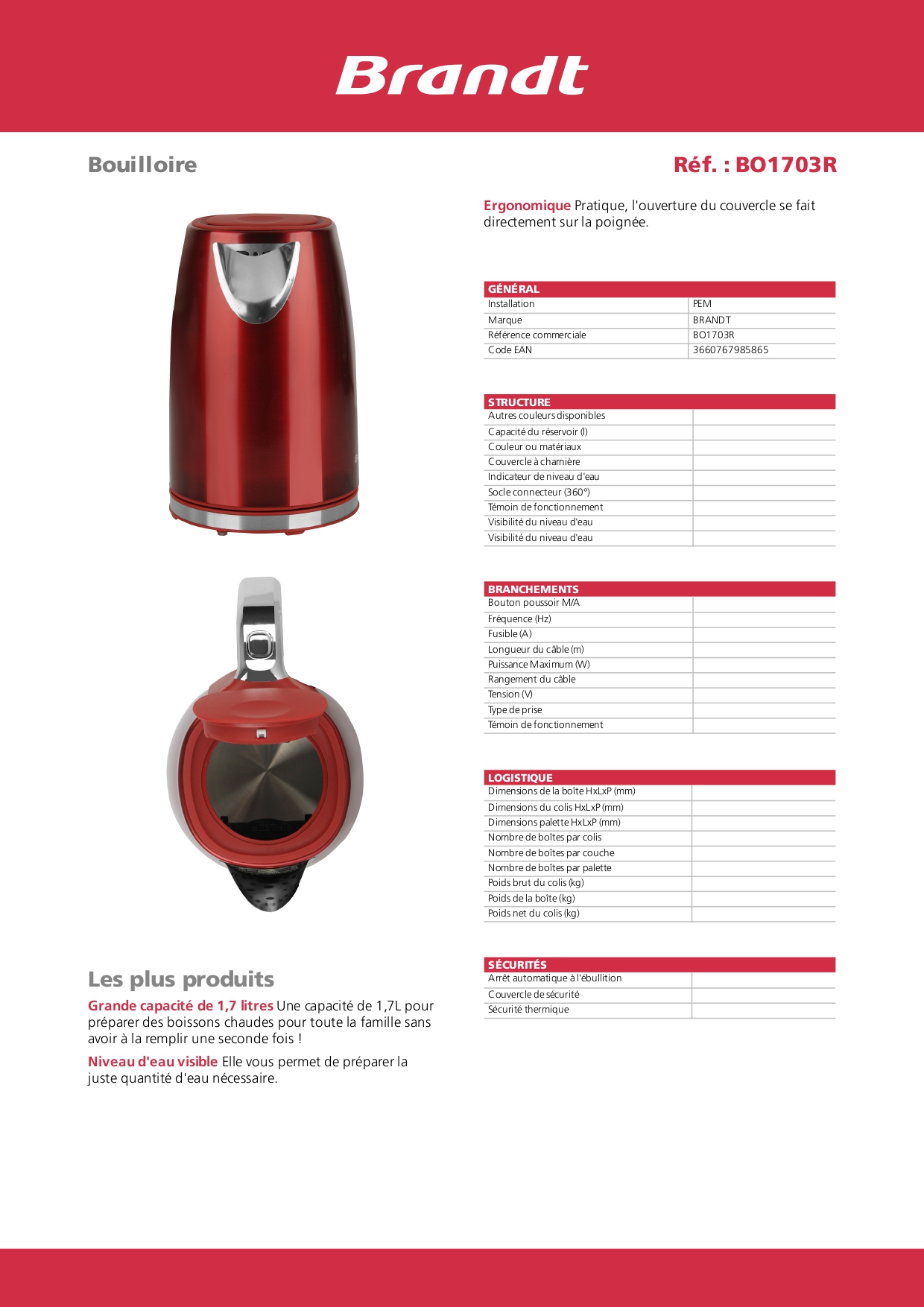 BRANDT Bouilloire 1.7 L Rouge Inox – BO1703R