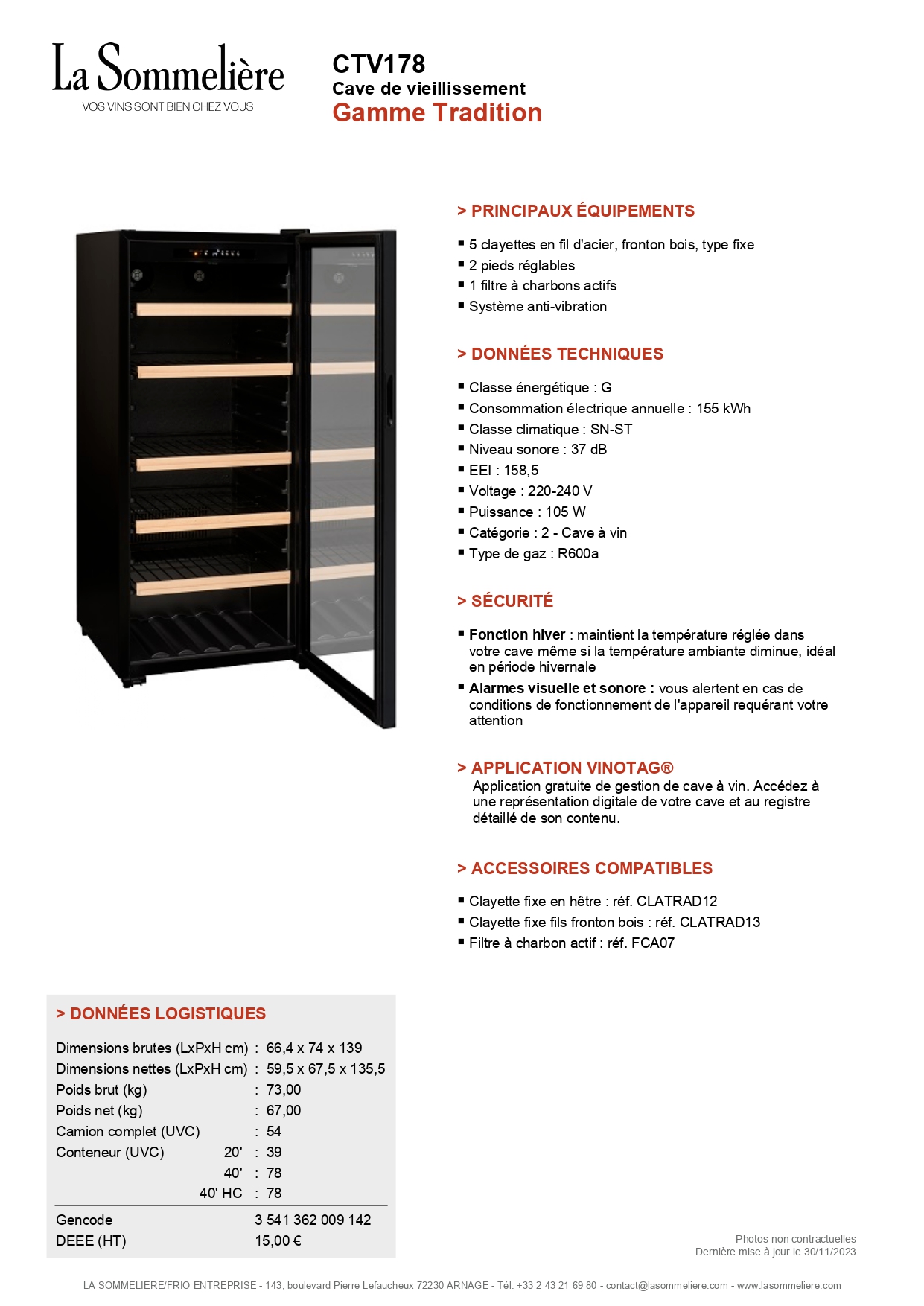Cave à vin CTV178 La Sommelière 165 bouteilles
