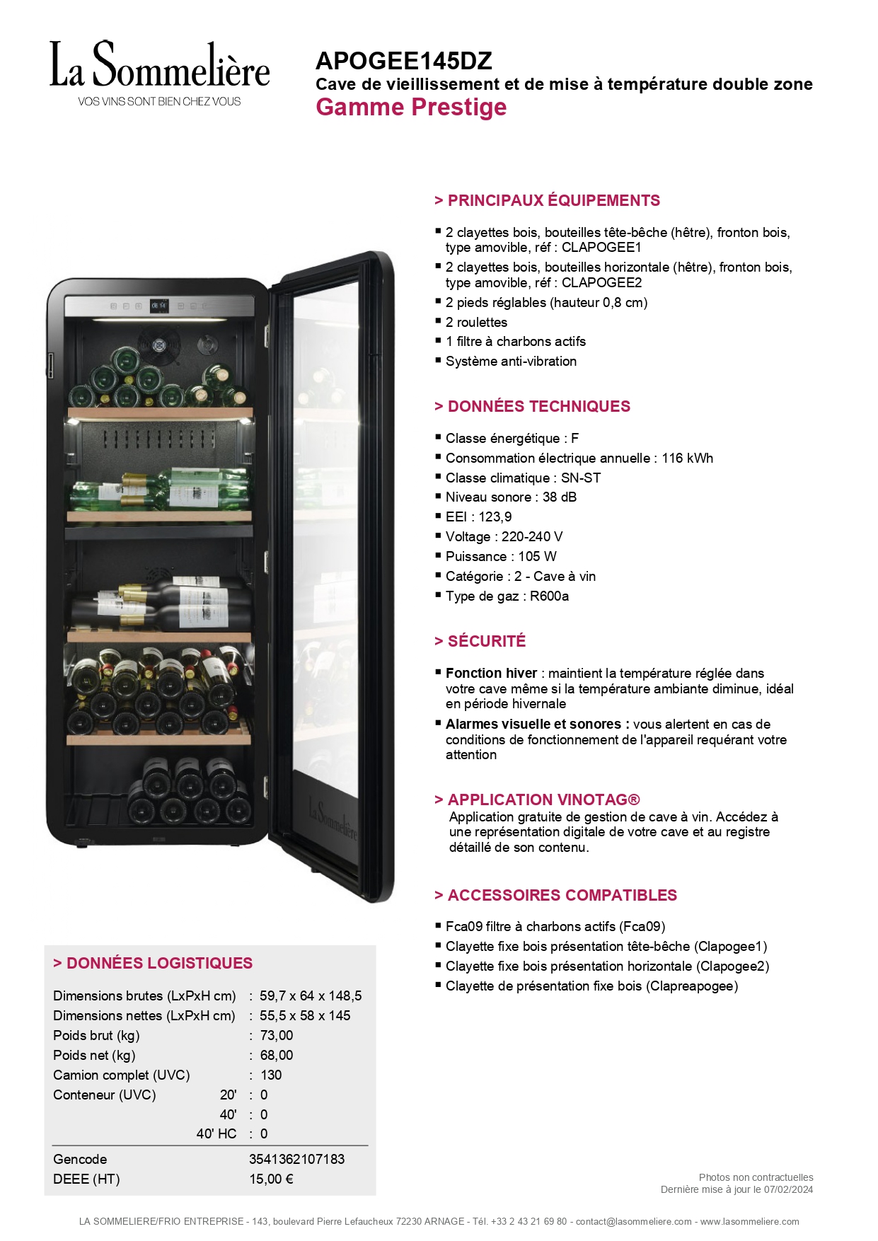 Cave à vin double zone La Sommelière APOGEE145DZ 143 bouteilles