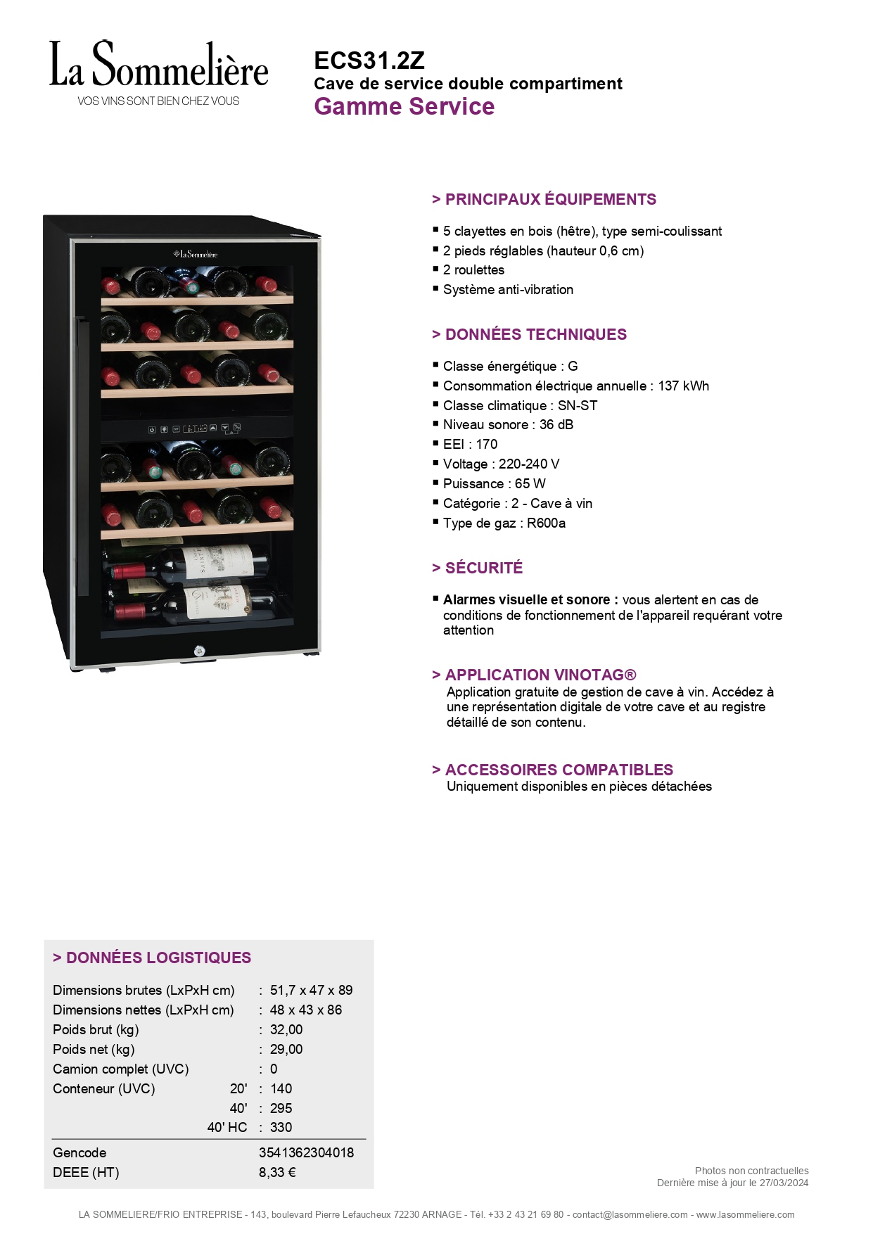 La nouvelle cave à vin ECS31.2Z, d’une capacité de 29 bouteilles, associe un design contemporain à une élégance pratique. Dotée de 5 clayettes en bois de hêtre et d’une poignée noire, elle s’intègre parfaitement dans votre espace.