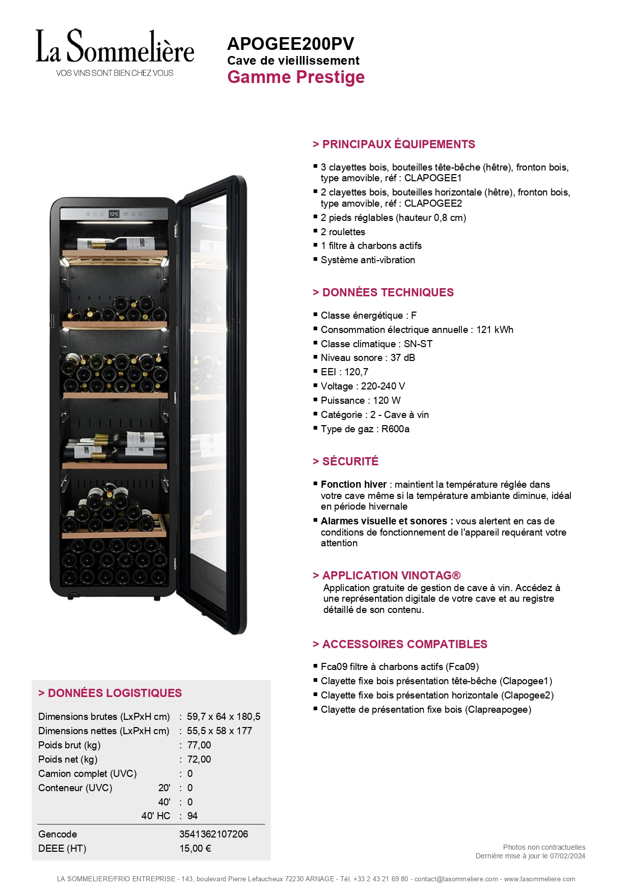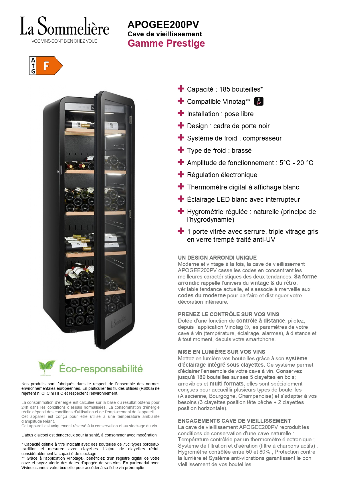 La cave de vieillissement APOGEE200PV reproduit les conditions de conservation d’une cave naturelle pour accompagner vos vins jusqu’à leur apogée. Contrôlable à distance, elle vous permet également de piloter, depuis l’application Vinotag®, les paramètres de votre cave à vin (température, éclairage, alarmes), à distance et à tout moment, depuis votre smartphone ou tablette. Vos grands crus sont conservés en toute sécurité dans cette banque de vin connectée.