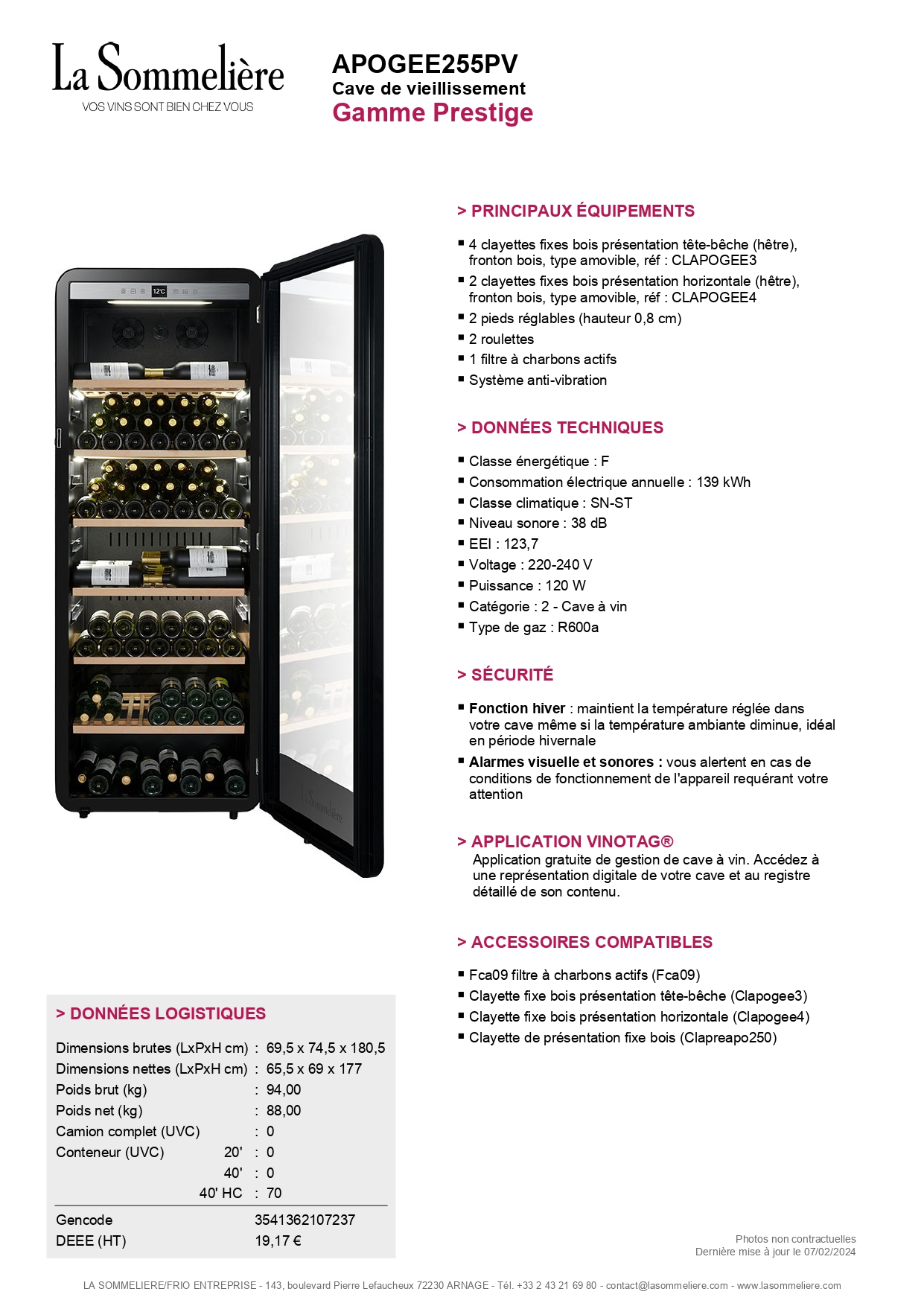 Cave à vin La Sommelière APOGEE255PV 254 bouteilles