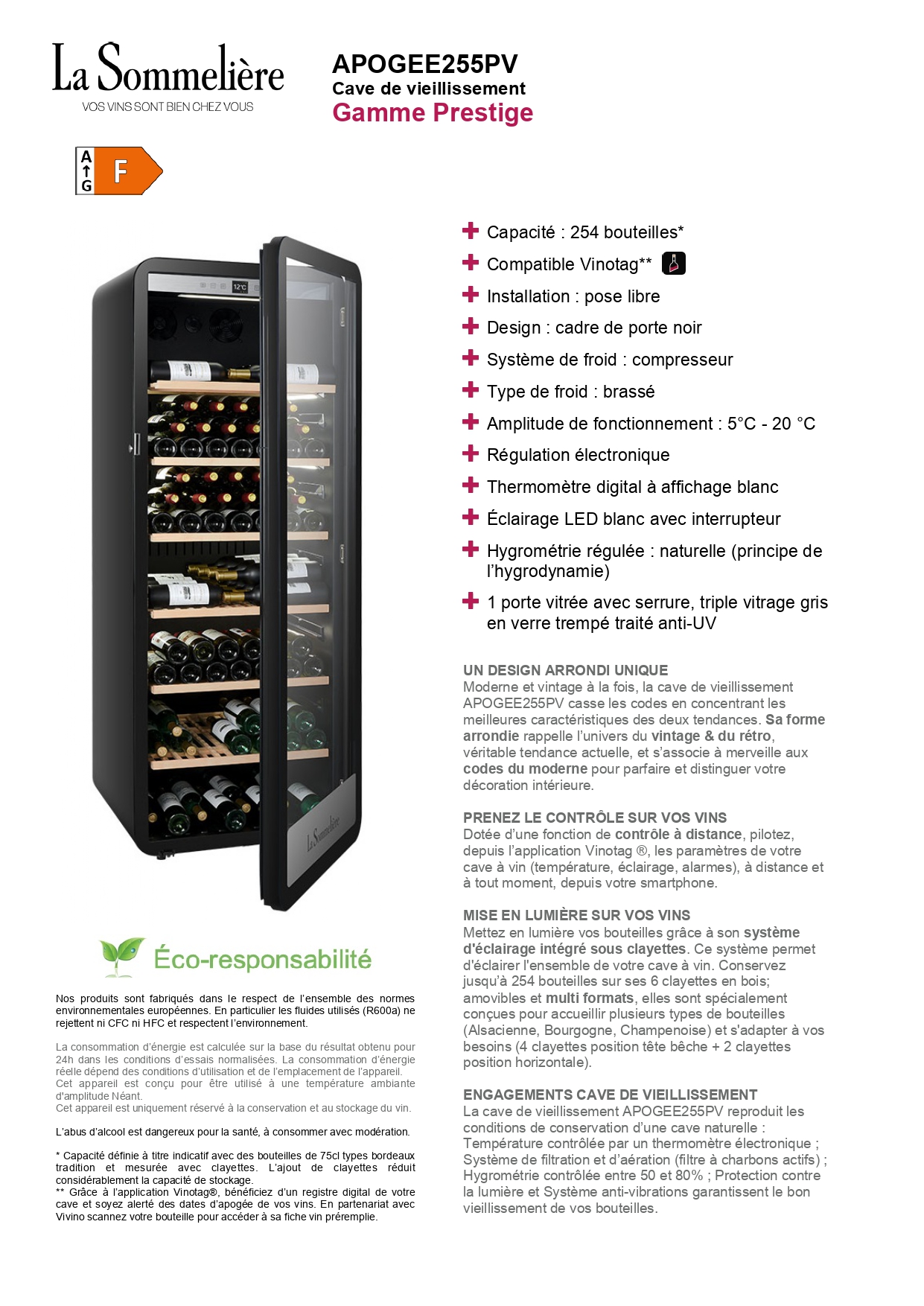 La cave de vieillissement APOGEE255PV reproduit les conditions de conservation d’une cave naturelle pour accompagner vos vins jusqu’à leur apogée. Contrôlable à distance, elle vous permet également de piloter, depuis l’application Vinotag®, les paramètres de votre cave à vin (température, éclairage, alarmes), à distance et à tout moment, depuis votre smartphone ou tablette. Vos grands crus sont conservés en toute sécurité dans celle banque de vin connectée.