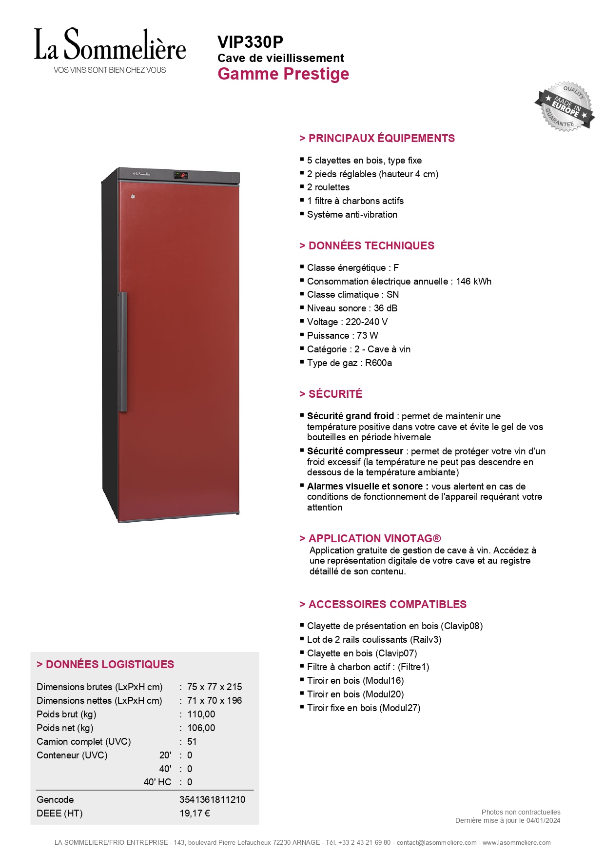 Cave à vin VIP330P La Sommelière 329 bouteilles