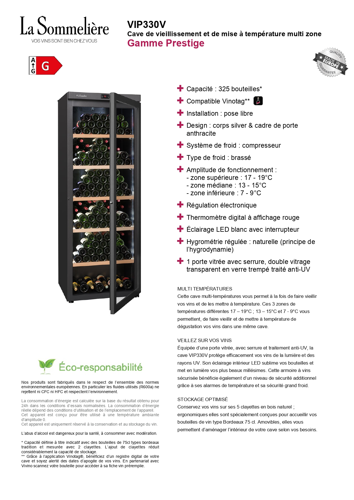 Cave à vin VIP330V La Sommelière multi-zones 329 bouteilles