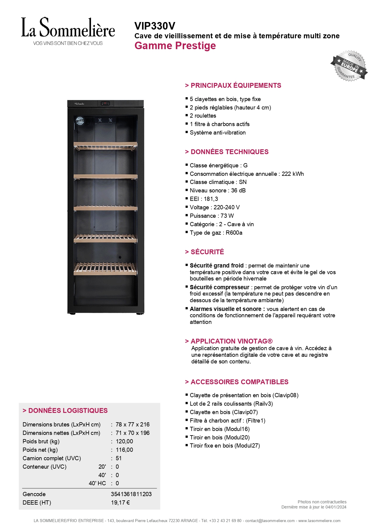 Cave à vin VIP330V La Sommelière multi-zones 329 bouteilles