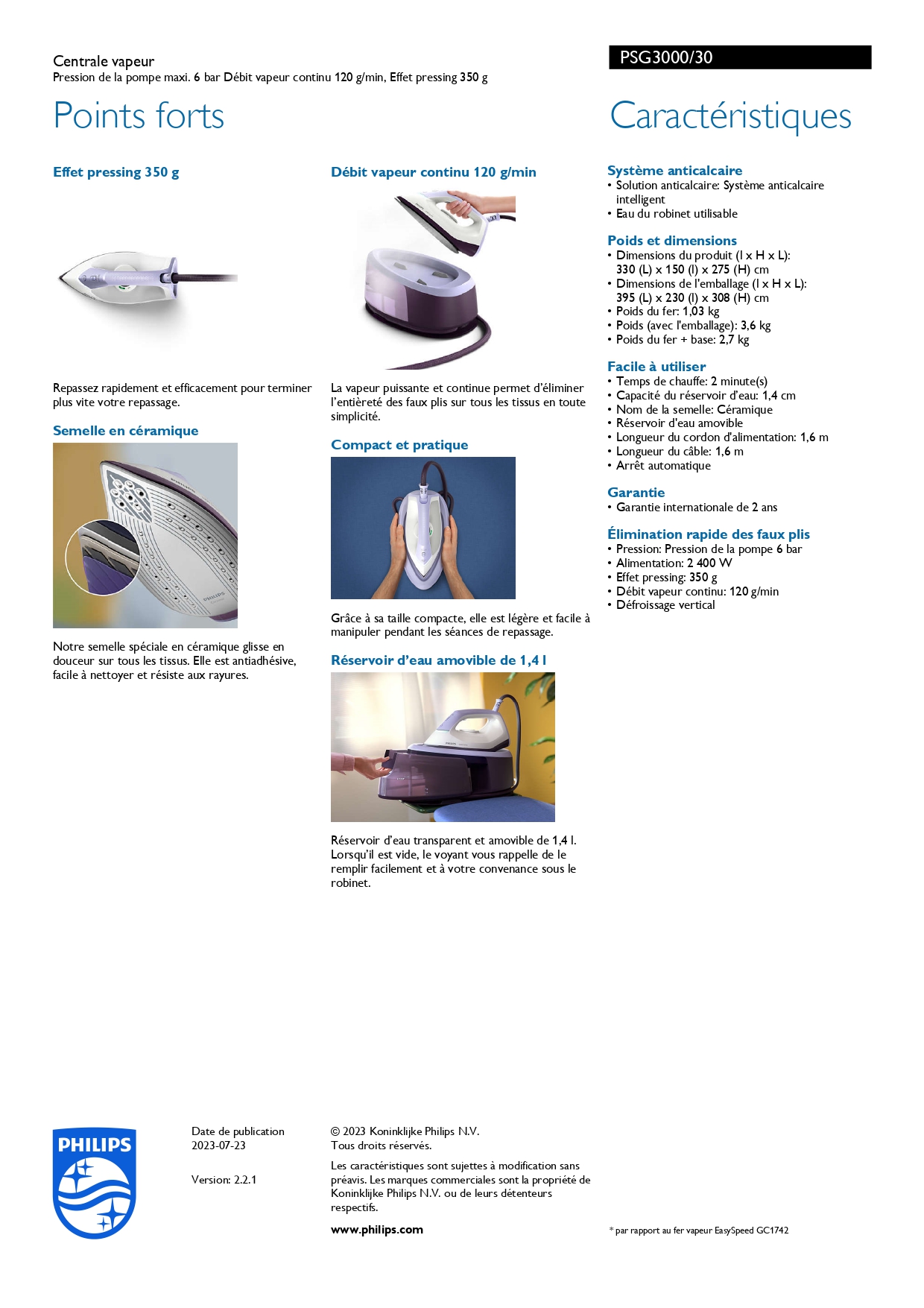 | Débit vapeur pour la fonction pressing (g/min) | 350 |