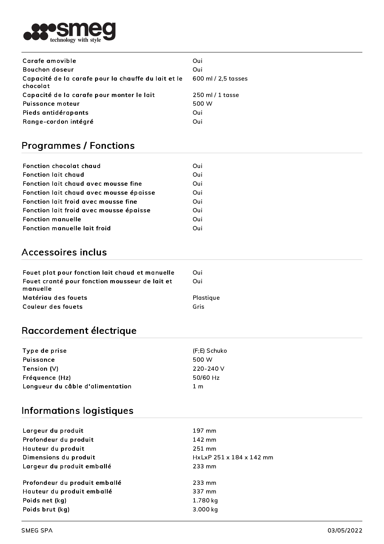 | Plus de caractéristiques | Pieds anti-dérapant: Oui Longueur de câble: 1 m Marque: Smeg Disponibilité magasin: Béziers Weight: 3 kg |
