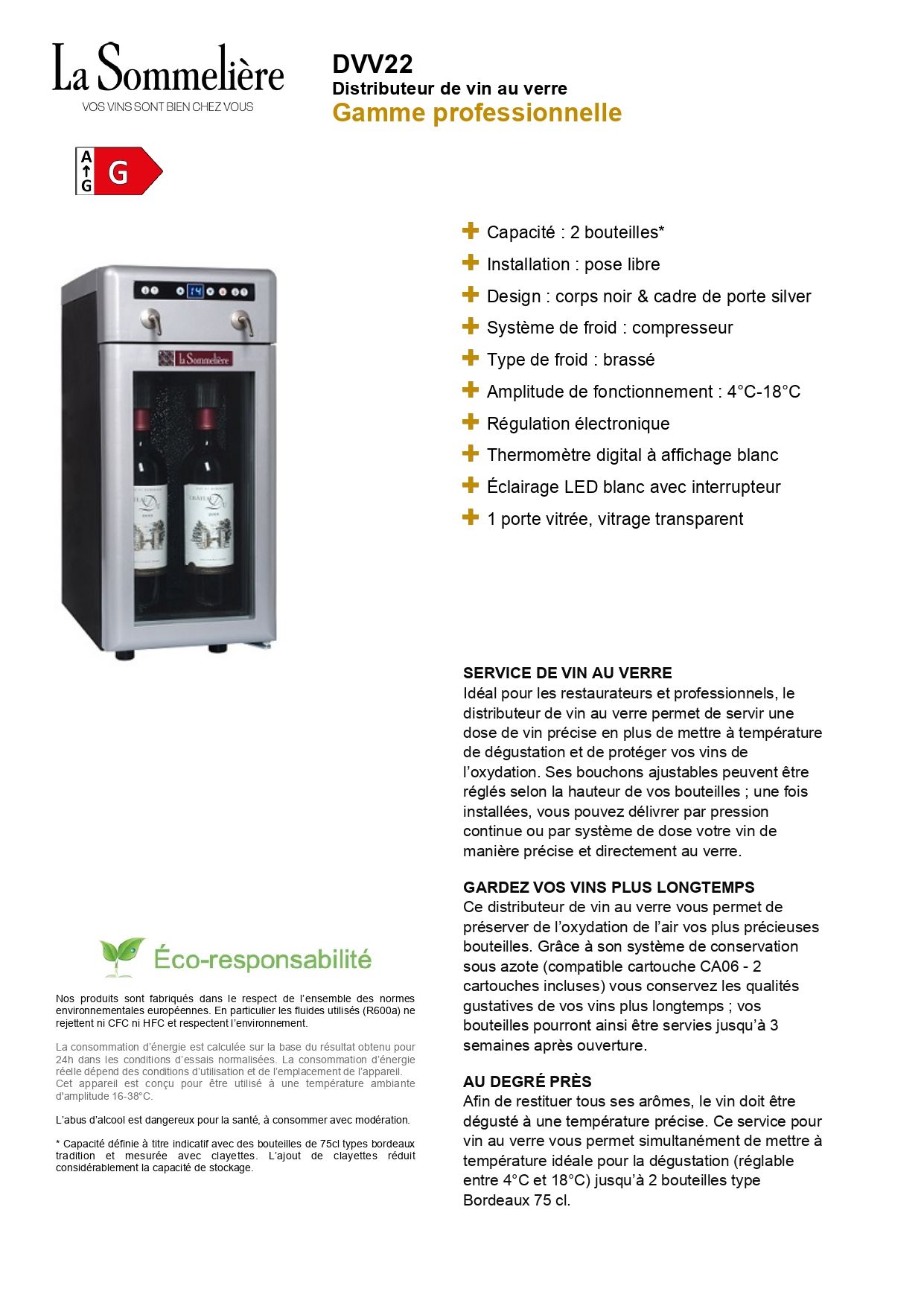 Le service de vin au verre DVV22 vous permet simultanément de mettre une bouteille à température idéale pour la dégustation, de préserver le vin de l’oxydation de l’air et de servir au verre vos plus précieuses bouteilles. Vos vins seront conservés plus longtemps et pourront ainsi être servis jusqu’à 3 semaines après ouverture.