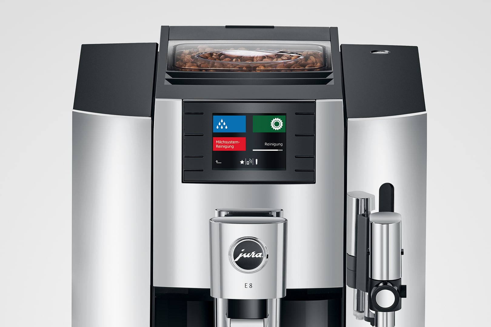 Grâce au circuit de liquides perfectionné, même le nettoyage du système de lait s’effectue automatiquement par simple pression d’une touche : une autre fonction empruntée aux lignes premium de JURA. L’E8 séduit également par son maniement encore plus intuitif et sa grande simplicité d’utilisation.