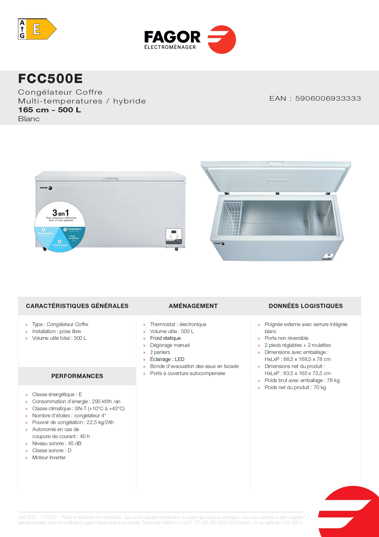 Congélateur coffre – Multi-températures / hybride : 3 appareils en 1 (Réfrigérateur +7 à +4 °C / Conservateur -13 à -17°C / Congélateur -18 à -24°C) – Fonction super Congélation – Froid statique – Dégivrage manuel – Bonde d’évacuation des eaux en façade – Eclairage LED – Porte à ouverture autocompensée – Poignée externe avec serrure intégrée – 2 pieds réglables + 2 roulettes – Régulation électronique – Moteur Inverter – Livré avec 2 paniers.
