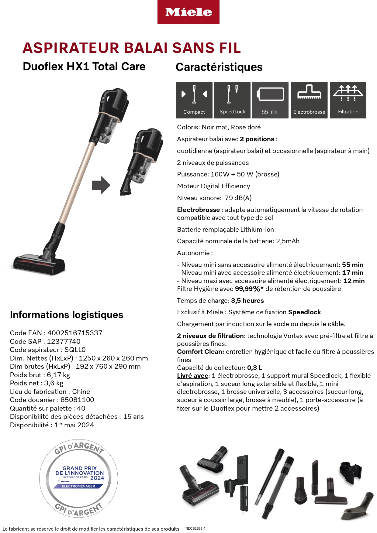 MIELE Aspirateur balai sans fil – HX1 Total Care – DUOFLEXHX1TCARE