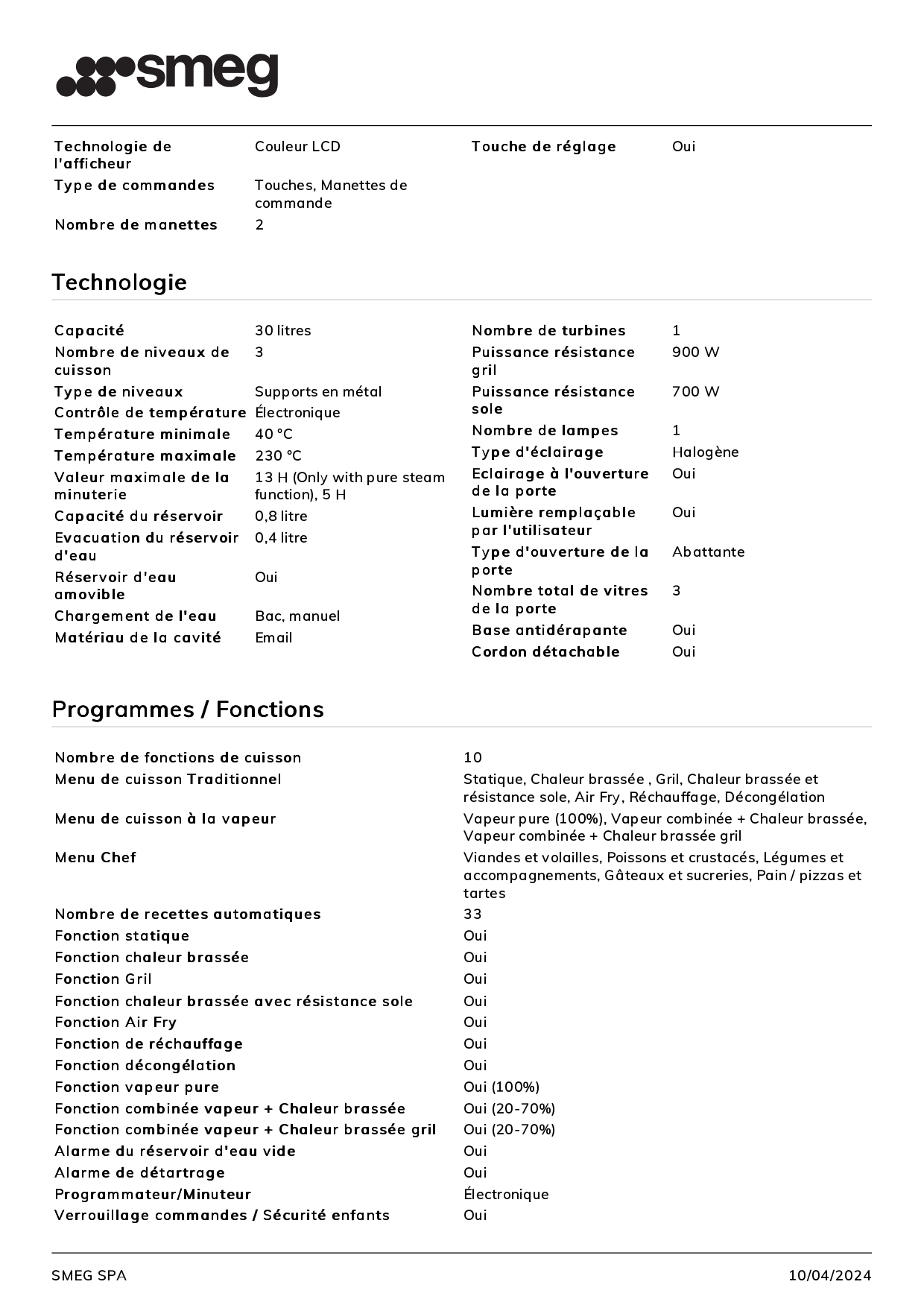 | Autre(s) fonction(s) | Vapeur, Menu de cuisson traditionnel (Statique, Chaleur brassée, Gril, Chaleur brassé et résistance sole, Air Fry, Réchauffage, Décongélation), Menu de cuisson à la vapeur (Vapeur pure, Vapeur combinée + chaleur brassée, Vapeur combinée + Chaleur brassée gril), Menu Chef (Viandes et volailles, Poissons et crustacés, Légumes et accompagnements, Gâteaux et sucreries, Pain / Pizza et tartes), 33 recettes automatiques |