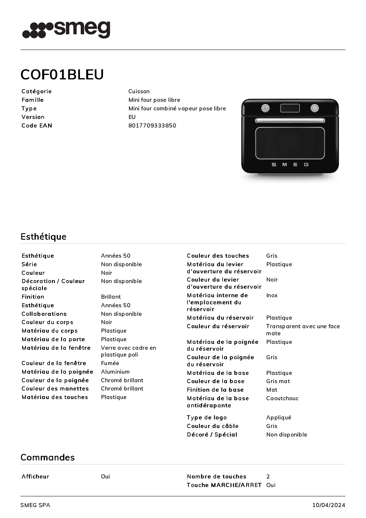 | Autre(s) fonction(s) | Vapeur, Menu de cuisson traditionnel (Statique, Chaleur brassée, Gril, Chaleur brassé et résistance sole, Air Fry, Réchauffage, Décongélation), Menu de cuisson à la vapeur (Vapeur pure, Vapeur combinée + chaleur brassée, Vapeur combinée + Chaleur brassée gril), Menu Chef (Viandes et volailles, Poissons et crustacés, Légumes et accompagnements, Gâteaux et sucreries, Pain / Pizza et tartes), 33 recettes automatiques |