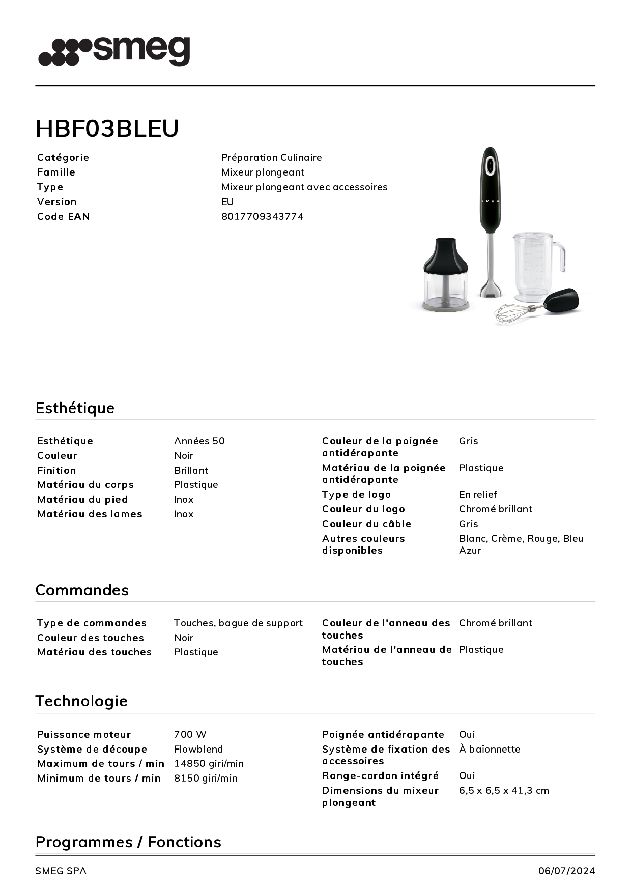 Mixeur plongeant avec accessoires SMEG Noir HBF03BLEU