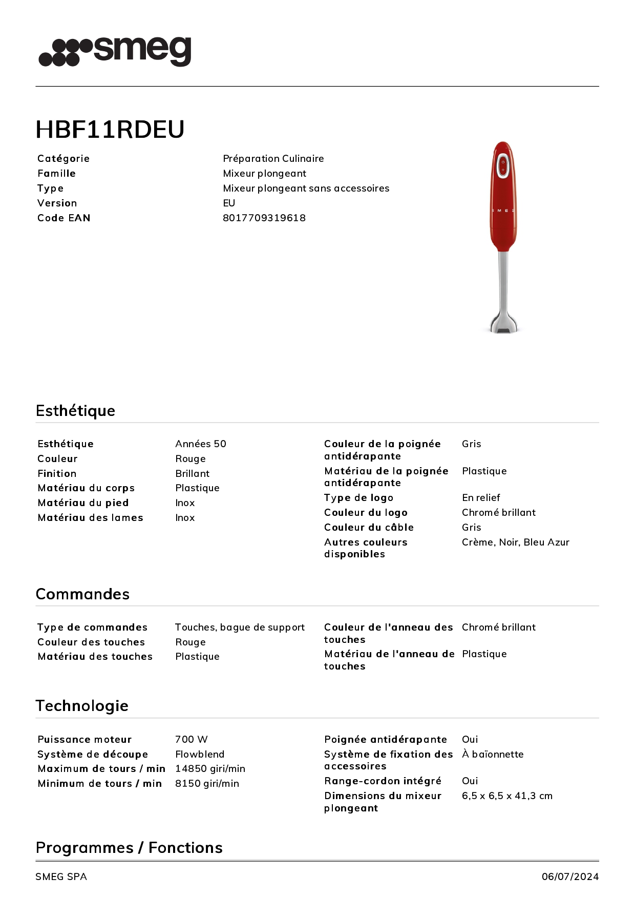 Mixeur plongeant Rouge SMEG HBF11RDEU